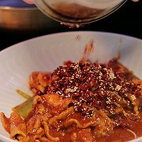 做法图解9:最后下红椒丝,同时放半勺生油,适量盐调味。