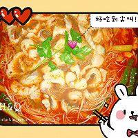 做法图解10:10.炒至火锅底料融化,加适量的开水然后把青瓜条豆芽放进去煮,煮开之后下鱼片,鱼片薄的话很容易熟,汤沸腾的时候就可以倒鱼片了,倒进去记得迅速摊开,不然有一些碎了,有一些还没熟