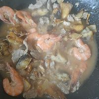 做法图解5:鱼煎微黄后放猪肉、鲜虾抄几下,倒点料酒