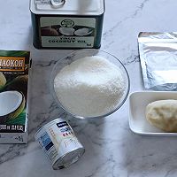 做法图解2:先分享一下斑斓椰蓉馅,此图中的材料都是做斑斓椰蓉馅的原料,可以选用自己喜欢的原料,椰子油,椰浆,炼乳,白豆沙馅,椰蓉,斑斓粉