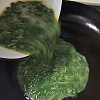 做法图解7:待蛋饼成型时翻面,可以顺势在锅里把蛋饼用铲子给分成小份,这样就不用在放到菜板上切了,煎至两面金黄就可以