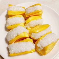 因为菠萝蜜本身就很甜,糯米饭中我没有拌白糖,如果喜欢甜一点的可以适量加白糖。椰浆和糯米饭的量有多的,可以多做几个也可以做成芒果版的。