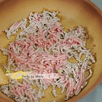 做法图解5:加入混合好的B材料翻炒,转小火把肉馅完全炒熟,关火备用