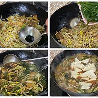 做法图解6:黄豆芽炒出水分,淋入老抽翻炒均匀让锅内食材均匀上色。海带丝入锅翻炒片刻,加入开水没过食材。开锅后下入豆腐片。