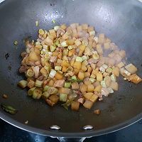 做法图解5:倒入土豆丁和四季豆丁,炒至土豆微微透明。