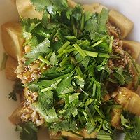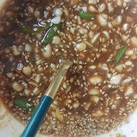 做法图解1:炸豆腐酱汁:?①芝麻、花生碎、葱末、蒜末、孜然粉(喜欢辣的可以再放些小米辣和烧烤料)备好后,加入一汤勺的热油淋上。?②继续加入生抽2勺、耗油1勺、芝麻酱1勺、醋1勺、白糖一大勺、最后一大把的香菜末,这是灵魂[偷笑]?拌起来,开吃[色][色][色]