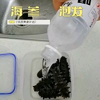 干海参5根,纯净水若干,葱白8段,油20克,蚝油10克,生抽15克,糖8克,料酒15克,胡椒粉 少许,鸡精少许,水40克,淀粉水(淀粉+水调开)50克