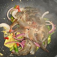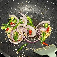 做法图解1:锅里放入油盐和洋葱青椒干辣椒蒜蓉一起炒出香味