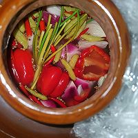 做法图解7:泡姜,泡椒,泡蒜苔,有泡豇豆的放泡豇豆,我没有了,蒜苔也不错