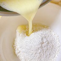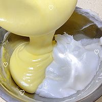做法图解9:再把第一次拌好的蛋液倒到蛋白里面翻拌