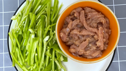 要根据自己的吃辣能力选择青椒的品种。里脊肉逆纹切丝,也可以让热心摊主处理。