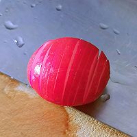 做法图解7:樱桃萝卜切蓑衣片,薄片,底部相连。
