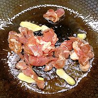 梅花肉130克,青椒3个,生姜1块,花生油适量,黄豆酱1勺,生抽1勺,腌肉调料:,料酒10毫升,生抽10毫升,玉米淀粉2克,花椒粉2克