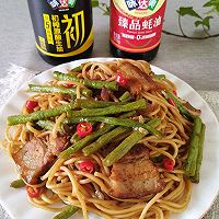 碱水面条200克,五花肉100克,豇豆一把,蒜6瓣,小米辣4个,味达美初榨生抽2勺,味达美臻品蚝油1勺