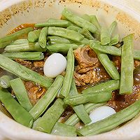做法图解8:已经炖煮30分钟,排骨基本软烂,倒入四季豆和鹌鹑蛋,盖盖继续炖到收汁。