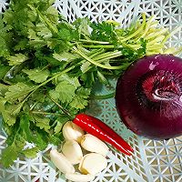 做法图解2:将洋葱、香菜、大蒜和小米辣洗净。
