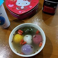 做法图解11:碗里加入干桂花和枸杞,放入烧好的五色元宵,即可享用