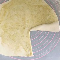 做法图解6:把调好的油酥均匀的抹在饼皮上。从一边切开,不要切断。