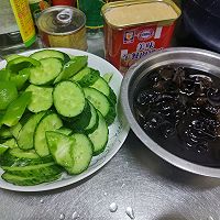 鸡蛋2个,黄瓜2根,木耳30g,盐三勺,生抽1勺,蚝油1勺,老抽1勺,青椒1个,姜2片,蒜3瓣,食用油3勺,午餐肉半罐