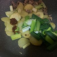 做法图解10:加入食盐,待土豆的白色快消失时,也就是土豆快熟了,就倒入蒜苗,根据自己口味,我这里自己加了点豆瓣酱,更香。