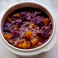 做法图解4:生紫薯跟南瓜丁一块儿下,熟薯不着急等米煮得差不多了扔进去搅和搅和稍微一咕嘟就好