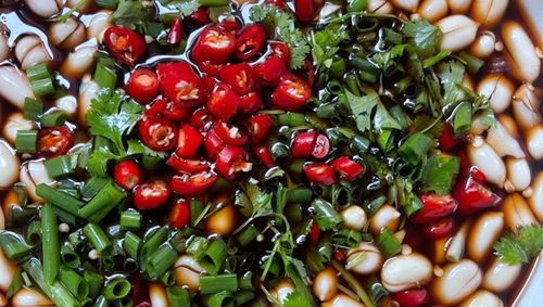 做法图解4:选用的珍选生腌捞汁,用了大半瓶泡花生米