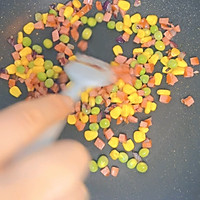 做法图解4:最后放入煮熟的甜玉米粒跟豌豆,翻炒两分钟盛出备用。
