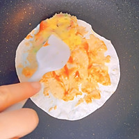 做法图解7:平底锅开小火,不用放油,放入卷饼,根据各人口味刷上番茄酱或者沙拉酱,我还放了肉松。