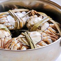 做法图解3:大闸蟹肚皮朝上放入蒸锅,蒸锅内可放些紫苏,再放上一些生姜片,盖上锅盖,大火蒸15-18分钟。