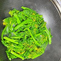做法图解2:水开放菜芯焯水捞出,起锅烧油放蒜米炒香,再放入焯好水的菜芯,放入适量盐,翻炒均匀即可出锅