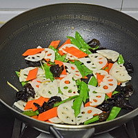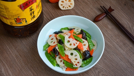 莲藕200克,胡萝卜100克,荷兰豆100克,泡发木耳100克,外婆乡小榨菜籽油20克,姜丝5克,盐2克,白糖3克,玉米淀粉10克,清水120克