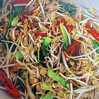做法图解4:放入尖椒丝、油菜、绿豆芽,调入生抽、蚝油、盐翻炒至断生;