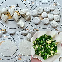 做法图解8:醒好的面团揉光滑,搓成长条切成均匀的剂子压扁,擀成饺子皮放入馅料包成饺子,(饺子的型状随意)
