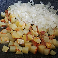 做法图解2:小火煎上色了翻面挪旁边切上只甜洋葱给豆增香
