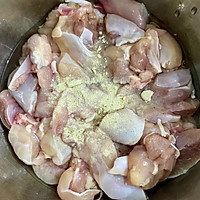 做法图解1:鸡腿肉洗净,加入料酒,白胡椒粉抓匀腌制去腥