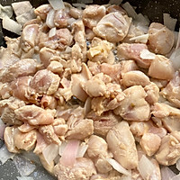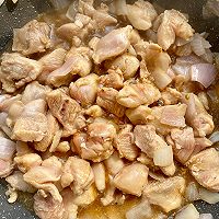 做法图解4:加入腌好的鸡腿肉翻炒均匀