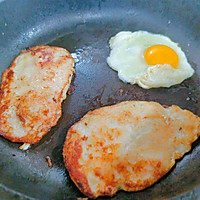 做法图解2:锅中少许油,放入鸡排,鸡蛋全部煎熟