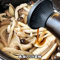 做法图解2:再倒入两勺9菇鲜,一勺蚝油,两勺白糖,少许淀粉,抓至均匀。